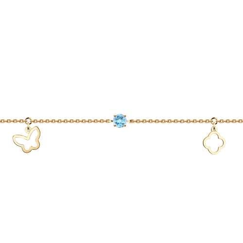 Изящный легкий браслет-цепочка с декоративными подвесками и вставкой с голубым топазом swiss выполнен из красного золота 585 пробы. Украшение очень нежно и очаровательно смотрится на руке, яркий акцент топаза привлекает взгляд и красиво переливается на свету. Приобретайте замечательное украшение для утонченного романтичного образа по выгодной цене в магазинах Мир Золота.