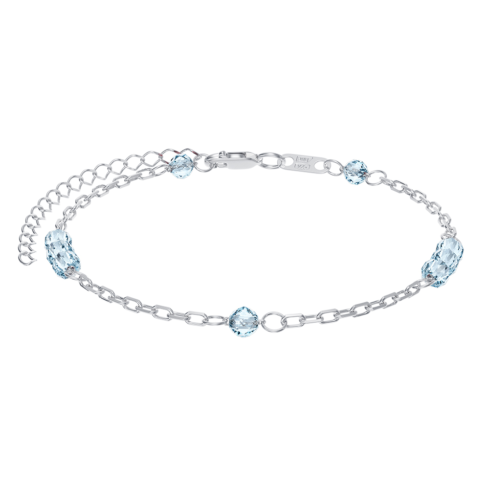 Трендовый браслет из серебра 925 пробы с композицией из голубых топазов – аксессуар, с которым не захочется расстаться. При каждом движении руки он будет напоминать о себе легким и ненавязчивым переливом полудрагоценных камней. Украшение представлено в самой нежной коллекции «Самоцветы и жемчуг» от производителя KRASTSVETMET в ювелирных магазинах Мир Золота.