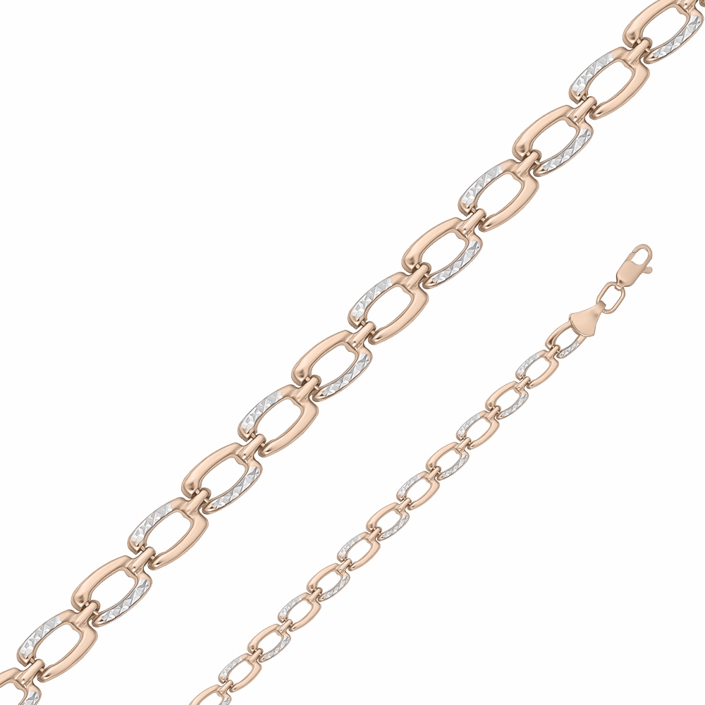 Универсальный женский браслет из комбинированного золота 585 пробы станет идеальным спутником любимым нарядам. Звенья драгоценной цепи акцентированы алмазной гранью на белом золоте. Браслет можно носить самостоятельно или в паре с часами. Приобретайте ювелирное украшение для себя или в подарок по выгодной цене в магазинах Мир Золота.