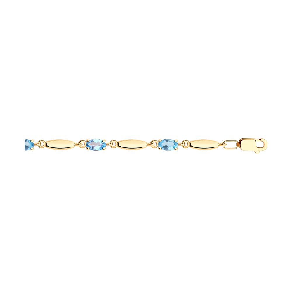 Декоративный браслет, украшенный вставками с голубыми топазами, выполнен из красного золота 585 пробы. Очень женственное и очаровательное украшение, с ярким сиянием нежных топазов в сочетании с глянцевым блеском золота, станет эффектным дополнением неповторимого образа. Приобретайте ювелирное украшение для себя или в подарок выгодно в магазинах Мир Золота.