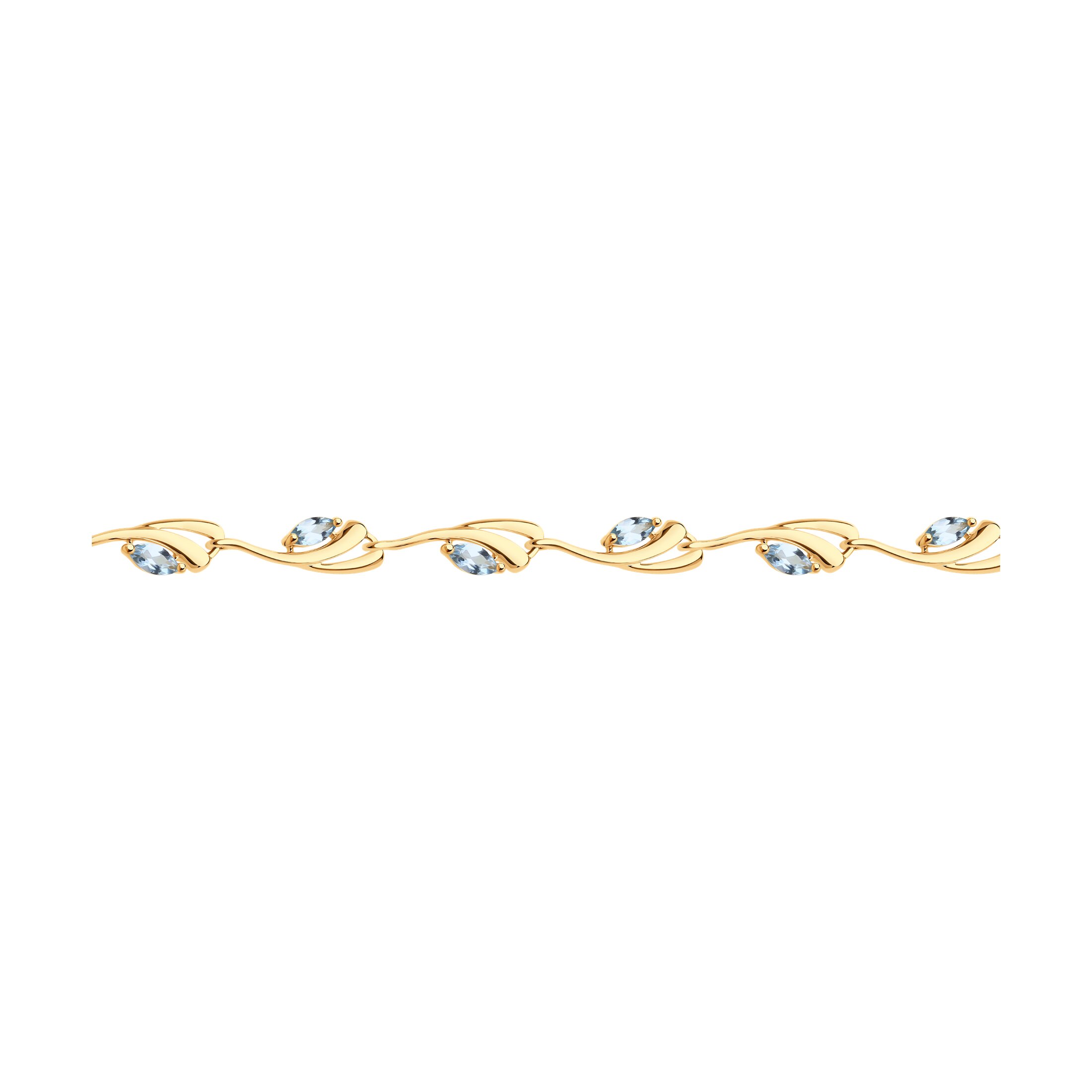 Декоративный браслет с голубыми топазами изысканной формы огранки выполнен из красного золота 585 пробы. Привлекательные нежные топазы в сочетании с благородным блеском золота притягивают взгляд. Изумительный браслет изящно смотрится на руке, и эффектно дополнит неповторимый женственный образ. Приобретайте ювелирное украшение в подарок по выгодным ценам в магазинах Мир Золота.