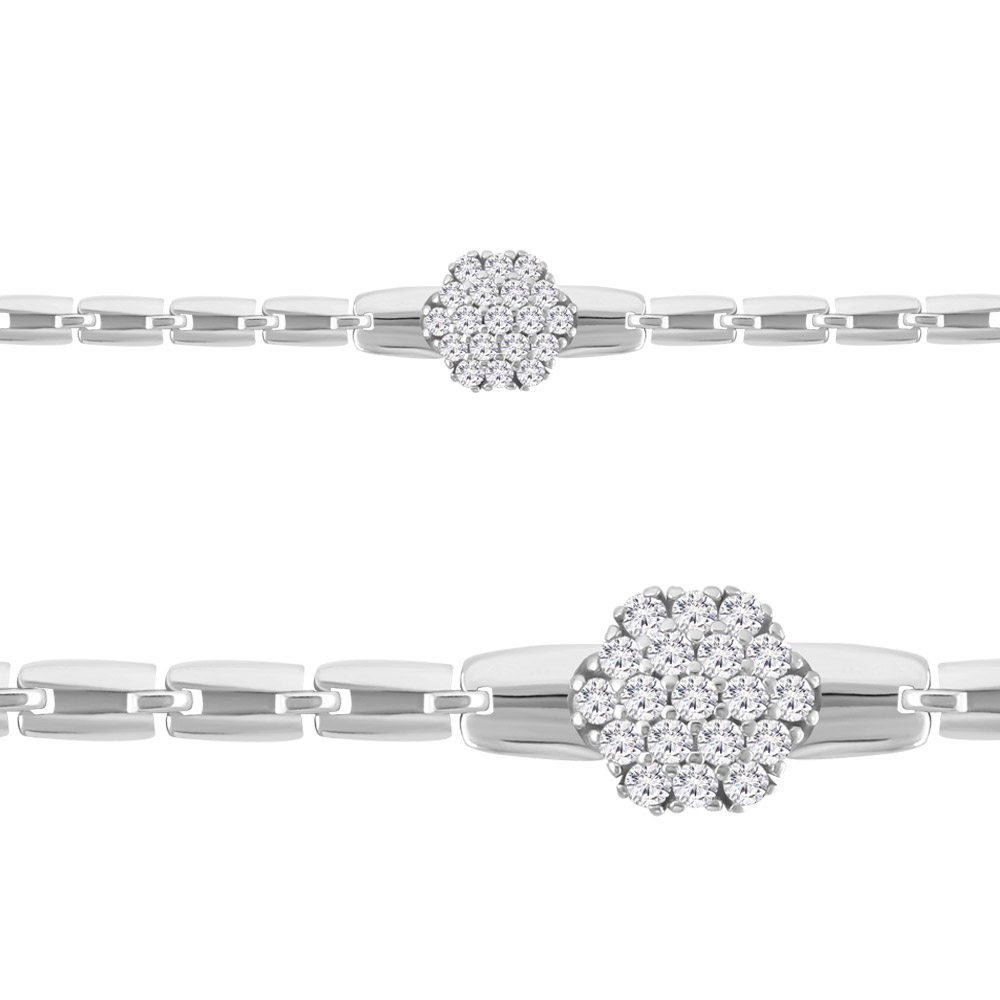 Декоративный глидерный браслет из родированного серебра 925 пробы украшен вставкой с россыпью сияющих фианитов. Универсальный аксессуар с изумительным блеском кристальных камней смотрится нежно и женственно, и может стать прекрасным вариантом базового украшения в женском гардеробе. Покрытие родием защищает серебро от потемнения, и придает изделию дополнительный блеск. Приобретайте браслет по выгодной цене в магазинах Мир Золота.