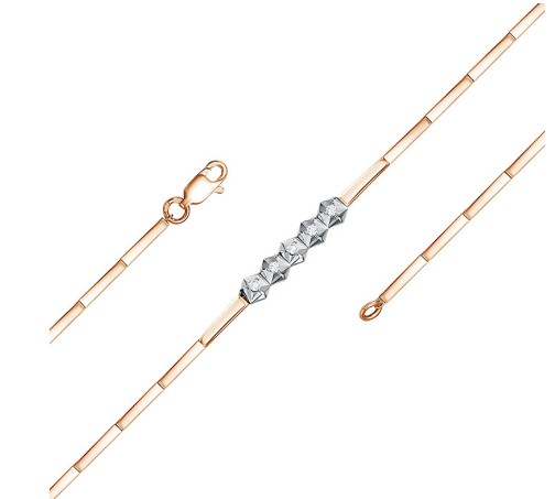 Утонченный браслет из красного золота 585 пробы декорирован вставками из белого золота с сияющими бриллиантами. Стильное украшение современного ювелирного дизайна с изысканным блеском драгоценных камней будет уместно смотреться и с повседневными, и с вечерними нарядами. Приобретайте ювелирное украшение в подарок по выгодным ценам в магазинах Мир Золота.