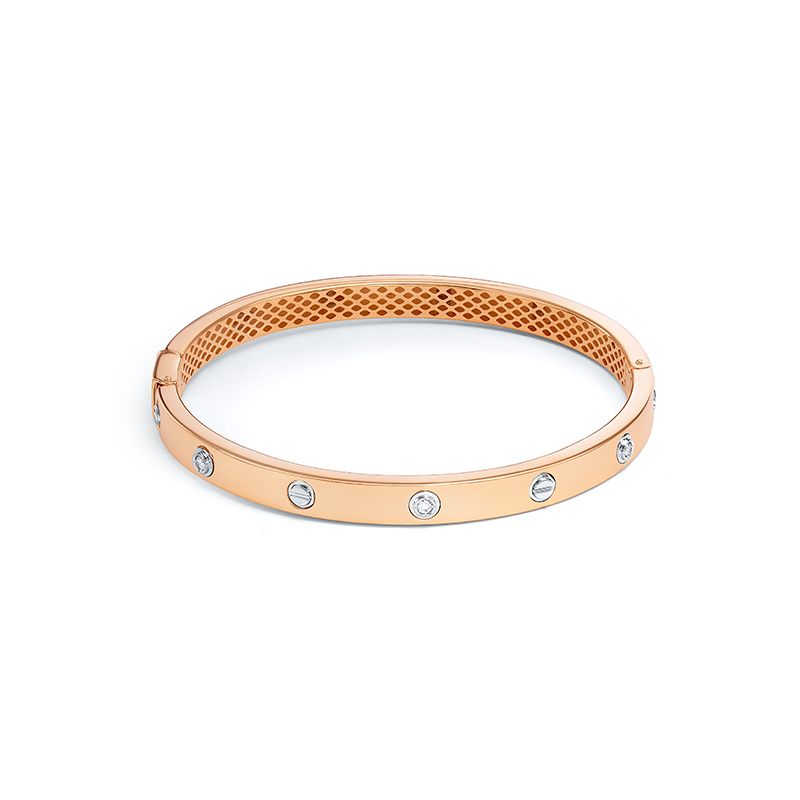 Трендовый браслет-обруч из красного золота в стиле известного бренда доступен с коллекцией Cartier style от ювелирного бренда DELTA. Мотив в виде винтов олицетворяет прочность и нерушимость чувств, а роскошные бриллианты всегда актуальны. Такой стильный браслет невозможно перепутать ни с каким другим.