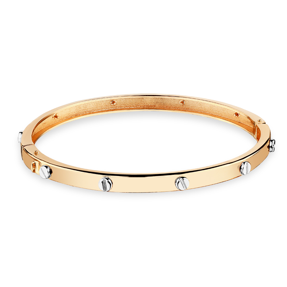 Стильный жёсткий браслет актуального ювелирного дизайна из красного и белого золота 585 пробы станет базовым аксессуаром для любого современного образа. Благородный блеск золота внесет нотку роскоши и элегантности в привычный образ владелицы. Приобретайте ювелирное украшение в подарок по выгодной цене в магазинах Мир Золота.