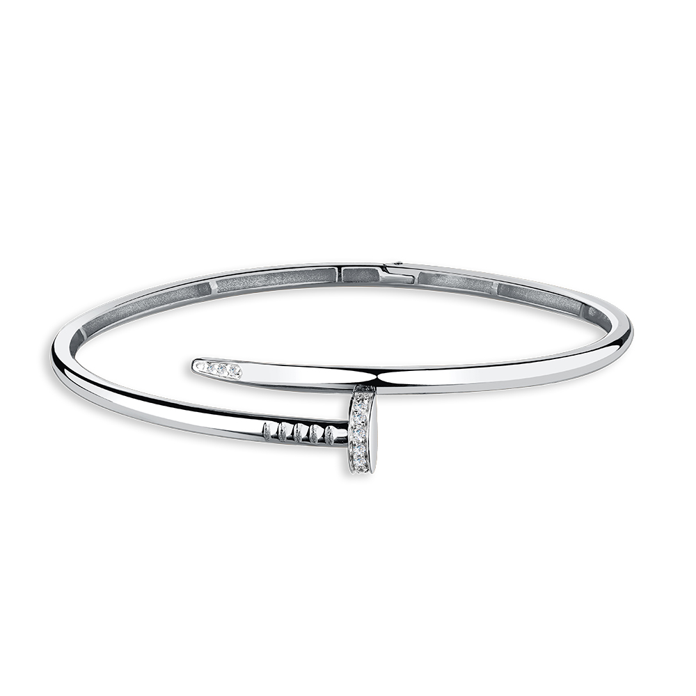 Стильный жёсткий браслет с сияющими фианитами выполнен из белого золота 585 пробы. Оригинальный популярный дизайн с кристальным блеском фианитов понравится поклонницам современных трендов, и отлично впишется в повседневные образы владелицы. Приобретайте ювелирное украшение в подарок по привлекательной цене в магазинах Мир Золота.