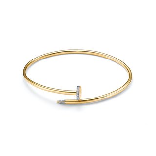 Стильный жёсткий браслет из желтого золота 585 пробы, украшенный сияющими фианитами, выполнен в актуальном ювелирном дизайне. Модное украшение в форме гвоздя с кристальным блеском камней отлично впишется в гардероб современной леди, подчеркнув изысканный вкус владелицы. Приобретайте браслет по привлекательной цене в магазинах Мир Золота.