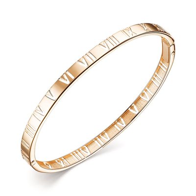 Женский браслет-обруч из красного золота с римскими цифрами. Цифры придают изделию стильный и оригинальный вид, подчеркивая индивидуальность обладательницы. Такой аксессуар станет отличным дополнением гардероба современной девушки, предпочитающей сочетание классической элегантности и современных тенденций моды.