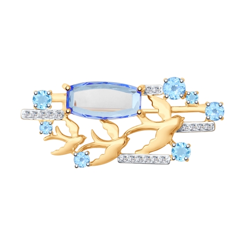 Очаровательная брошь из красного золота 585 пробы выполнена в оригинальном дизайне с миниатюрными птичками, голубым кварцем, топазами и кристальными фианитами. Изысканный дизайн с нежным сиянием ювелирных камней обращает на себя внимание, и добавит женственному образу нотку романтичного настроения. Приобретайте ювелирное украшение выгодно в магазинах Мир Золота.