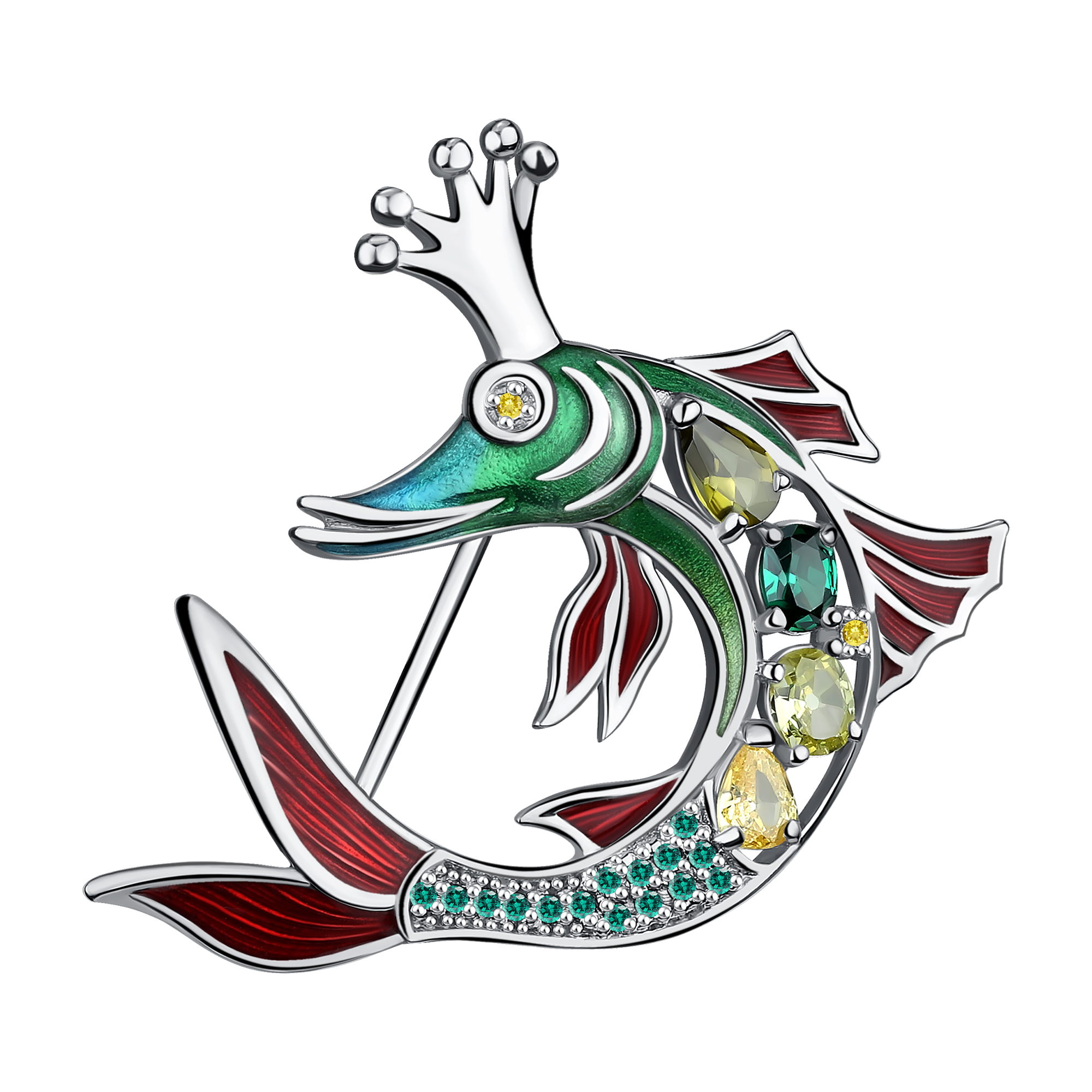 Брошь из серебра с фианитами «Щука» из коллекции «Русские сказки» изображает знаменитую волшебницу, исполняющую желания героя. Форма броши выполнена с тонким сочетанием металла и сверкающих камней, имитирующих чешую и глаза рыбы. Изделие отличается выразительными деталями: плавники изящно изгибаются, а хвостовая часть слегка приподнята, придавая динамику и живость. Это украшение прекрасно дополнит любой наряд, добавив элемент фантазии и очарования русского народного творчества.
