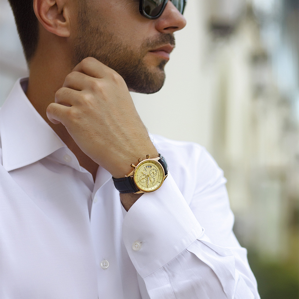 Многофункциональные мужские золотые часы, сочетающие в себе точность и элегантность - выбор активных и успешных! Стрелки с люминесцентным покрытием на циферблате цвета шампань светятся в темноте. Апертура даты демонстрирует сразу три дня. За точность хода отвечает надежный японский механизм. Коричневый кожаный ремешок с классической застежкой. Коллекция часов НИКА GENTLEMAN призвана наглядно демонстрировать статус и амбиции своего владельца. Приобретайте мужские золотые часы выгодно в магазинах Мир Золота.