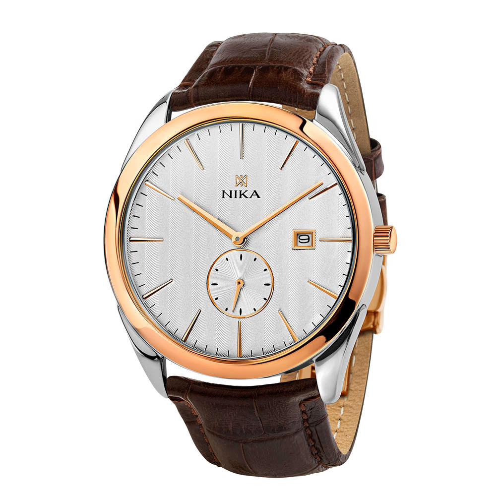 Мужчина высоко оценит роскошные черты этих элегантных наручных часов из коллекции SlimLine от компании Nika. Безель выполнен из красного золота 585 пробы. Секундная стрелка вынесена на отдельный циферблат. Циферблат серебряного цвета с золотыми метками в виде штрихов. Кожаный ремешок в коричневом цвете с классической застежкой. Управляйте временем в своем безупречном вкусе! Купите мужские часы по выгодной цене в магазинах Мир Золота.