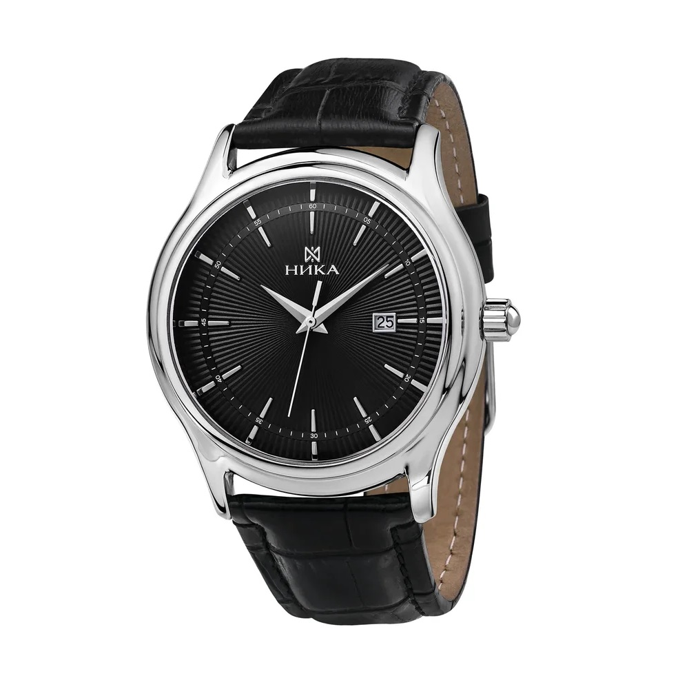 НИКА CELEBRITY — эталон мужских часов для стильных и уверенных. Массивный корпус анатомической формы выполнен из серебра. Чёрный цвет в дизайне часов считается сегодня одним из самых популярных. На лаконично оформленном циферблате расположись три стрелки и апертура даты. Тип механизма Ronda 1005. Удобный ремешок из натуральной кожи с классической застежкой. Купите уникальные мужские часы по выгодной цене в магазинах Мир Золота.