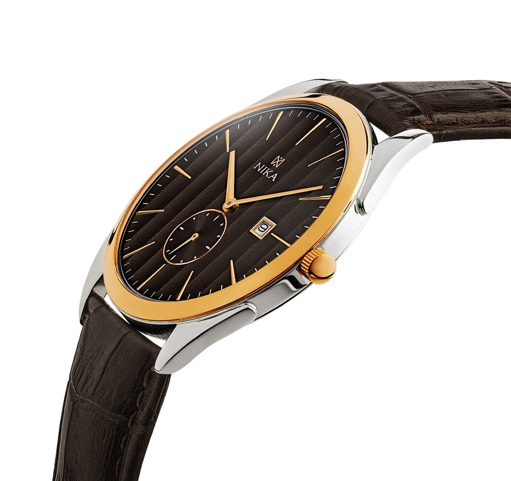 Мужчина высоко оценит роскошные черты этих элегантных наручных часов из коллекции SlimLine от компании Nika. Безель выполнен из красного золота 585 пробы. Секундная стрелка вынесена на отдельный циферблат. Черный циферблат с золотыми метками в виде штрихов. Кожаный ремешок в черном цвете с классической застежкой. Управляйте временем в своем безупречном вкусе! Купите мужские часы по выгодной цене в магазинах Мир Золота.