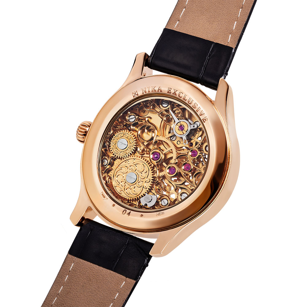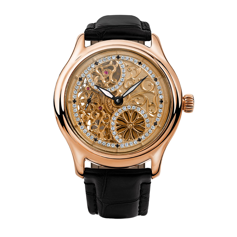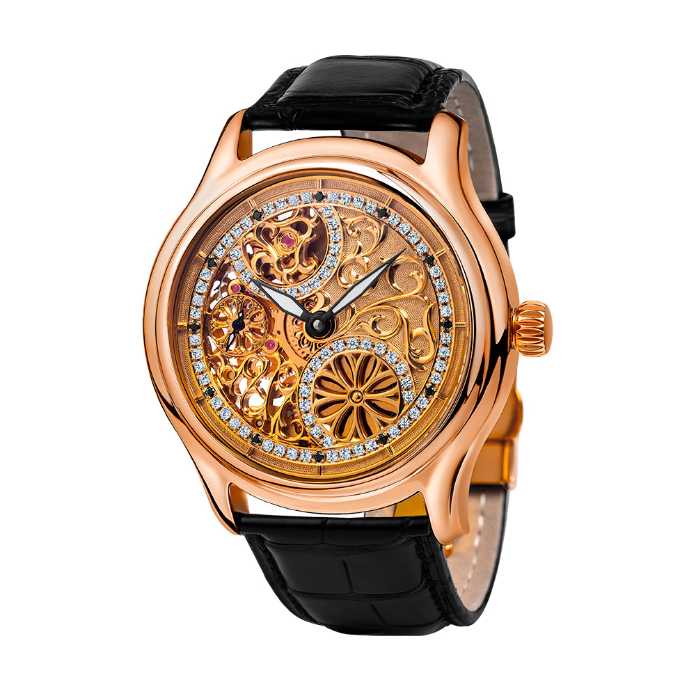 Эксклюзивные мужские часы из красного золота 585 пробы с бриллиантами и скелетонированным механизмом. Широкий чёрный ремешок из кожи аллигатора на каучуковой основе обеспечивает элегантность и комфорт при ношении. В основе часов лежит швейцарский механизм ETA 6497, демонстрирующий высочайшую точность хода и индикацию часов, минут и секунд. Циферблат представляет собой искусно выполненную композицию. Правая часть циферблата с матовой гравированной поверхностью контрастирует с витьеватыми узорами, в то время как левая сторона плавно открывает вид на механизм. Эта эксклюзивная работа часовых и ювелирных мастеров подчеркивается художественной резьбой и гравировкой, превращающими каждый компонент в произведение искусства. Особую ценность придают 91 бриллиант, встроенные в циферблат и сверкающие при любом освещении. Сверкающие бриллианты и искусно обработанные детали механизма рассказывают историю подлинной роскоши, превращая эти часы в достойное вложение, которое с годами будет лишь возрастать в ценности.