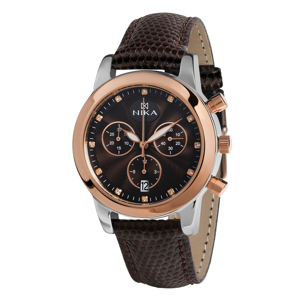 Женские часы-хронографы в двухцветном корпусе из серебра и золота станут самым желанным подарком. Это идеальный вариант для тех, кто любит комбинировать благородные металлы, выбирая самые смелые сочетания оттенков. Шоколадный циферблат часов украшают 12 изящных ювелирных кристаллов. Окошко даты находится в положении 6 часов. Удобный коричневый ремешок из натуральной кожи с классической застежкой. Купите уникальные женские часы по выгодной цене в магазинах Мир Золота.