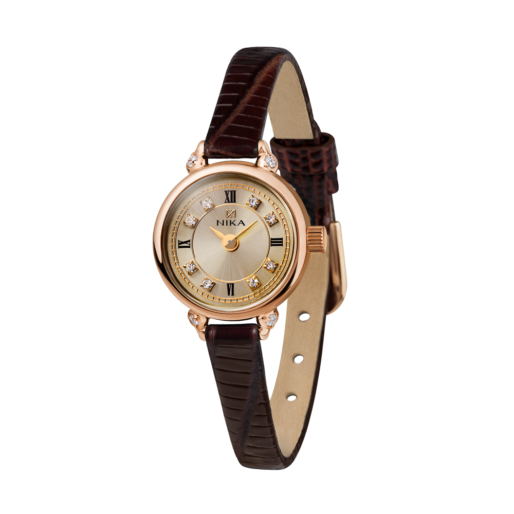 Элегантные классические часы Nika в золотом корпусе с сияющим фианитами идеально дополнят повседневные образы современной леди. Изящные часы на кожаном ремешке комфортны в носке, и подойдут к любому стилю одежды. Приобретайте кварцевые часы с надежным механизмом по привлекательной цене в магазинах Мир Золота.