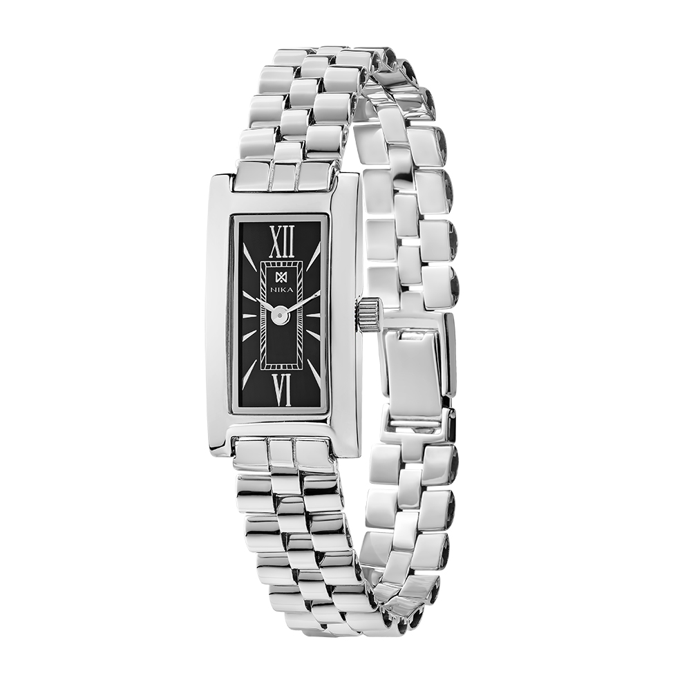 Серебряные женские часы NIKA с прямоугольным корпусом с черным циферблатом элегантно украсят женское запястье. Универсальные часы на ювелирном браслете из серебра 925 пробы и удобной застёжкой с регулировкой длины отлично подойдут для повседневного использования. Приобретайте кварцевые наручные часы по выгодной цене в магазинах Мир Золота.