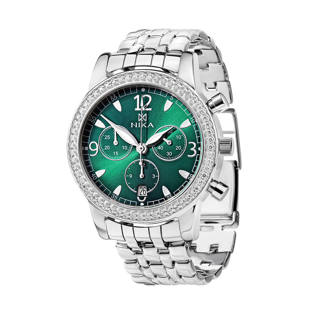 Стильный дизайн этого серебряного хронографа станет элегантным дополнением вашего повседневного образа. Изумрудный циферблат с метками в виде штрихов и арабских цифр выполнен по технологии Sunray (солнечные лучи). Окошко даты находится в положении 6 часов. Браслет с раскладывающейся застежкой. Коллекция EGO от компании Nika создана для ценителей качественных аксессуаров из драгоценных металлов, для тех, кто хочет подчеркнуть свой статус и безупречный вкус. Приобретайте серебряные часы выгодно в магазинах Мир Золота.