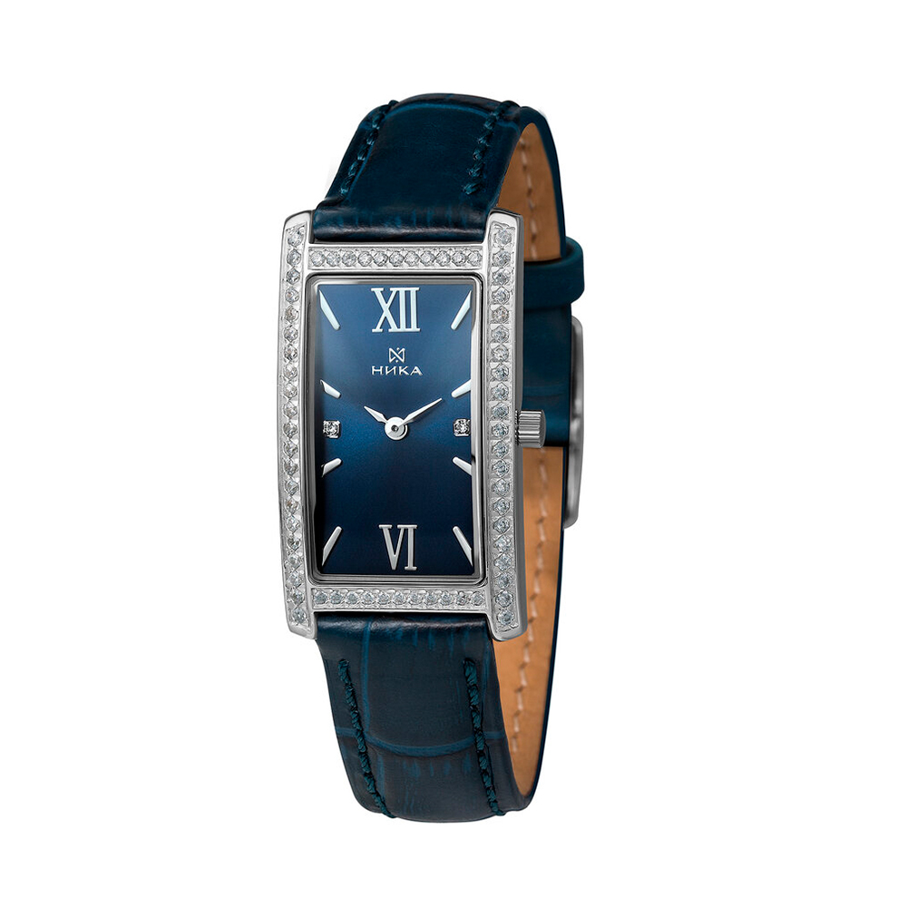 Женские серебряные часы НИКА LADY с крупным прямоугольным корпусом, декорированным сияющими фианитами, подчеркнут безупречный стиль и изысканный вкус своей обладательницы. Элегантные темно-синие часы с искристым блеском камней привлекают внимание, и станут яркой деталью повседневного лука. Приобретайте серебряные часы по выгодной цене в магазинах Мир Золота.