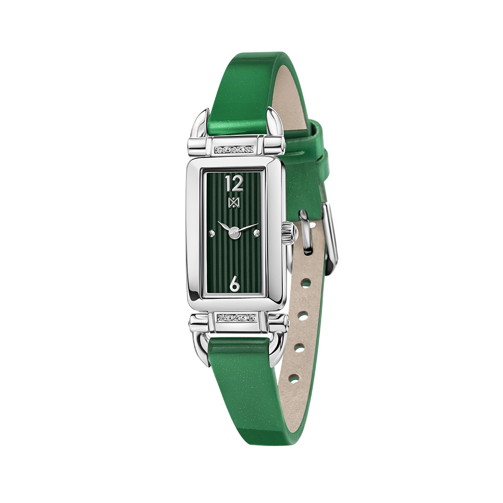 Утонченный женский аксессуар, который не оставит равнодушной ни одну модницу. Женские часы НИКА Lady с прямоугольным корпусом. Циферблат украшен гравировкой «венецианская полоска». Метки в виде точек и арабских цифр. Рифленая заводная головка. Лакированный зеленый ремешок с классичесой застежкой. Корпус украшен бриллиантами.