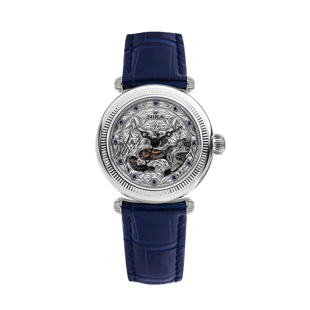 Женские наручные часы ручной работы Celebrity 1010 — это роскошные скелетоны из серебра, украшенные драгоценными камнями. Уникальный дизайн, драгоценные материалы и ручная работа — эти часы стали идеальным сочетанием ювелирного искусства и часового мастерства. Корпус из серебра 925 пробы с родиевым покрытием сохраняет благородный блеск и защищает от потемнения. Искусно вырезанный скелетон открывает вид на работу механизма. В качестве часовых меток используются сапфиры. Прозрачная задняя крышка демонстрируют работу механизма.