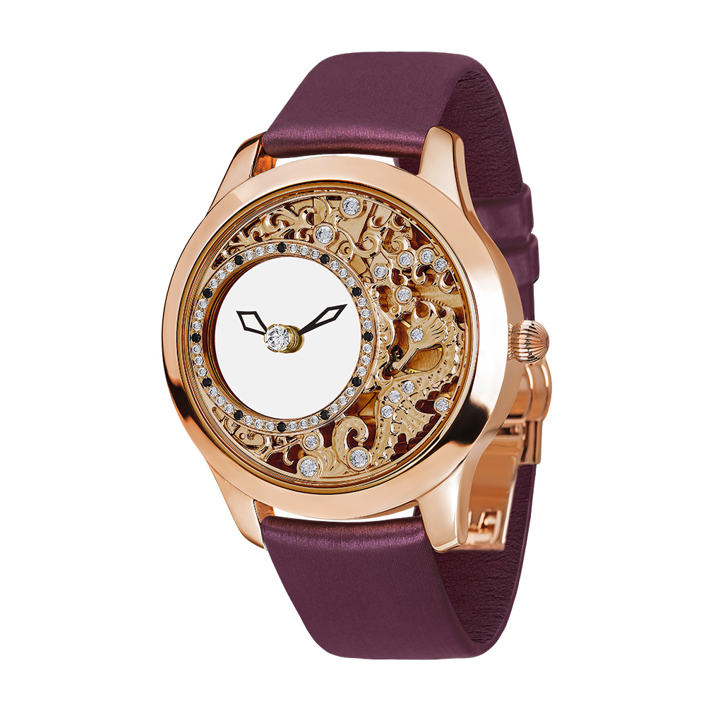 В этих наручных женских часах технологические инновации встречаются с ювелирным мастерством. Корпус из красного золота 585 пробы с благородным блеском подчеркивает изящность и статус владелицы, а ремешок из сатина на кожаной подкладке идеально подчеркивает премиальность модели. Главная особенность часов — полная невидимость механизма в прозрачном стеклянном круге циферблата. Стрелки будто бы парят в воздухе, создавая иллюзию, что время движется само по себе. Циферблат представляет собой дизайнерское совершенство. Прозрачный круг с парящими стрелками окружен скелетонированной композицией в виде волн океана и морского конька. Каждый элемент созданы с помощью ручной гравировки. Циферблат украшен россыпью фианитов. Задняя крышка также украшена гравировкой в морской тематике. MYSTERY CALYPSO — это женские часы, которые сочетают ручную работу мастеров высочайшего уровня и уникальный механизм, бросающий вызов традициям.