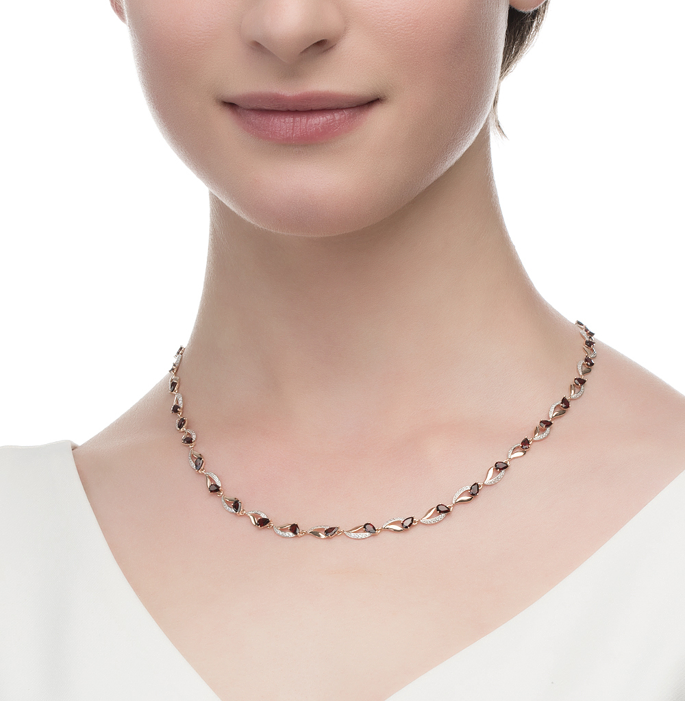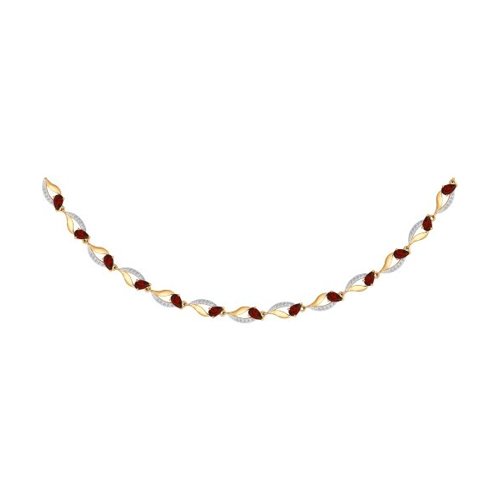 Роскошное колье из красного золота 585 пробы выполнено в изящном дизайне, с сияющими фианитами, выигрышно подчеркивающими насыщенность цвета прекрасных гранатов. Элегантное колье с ослепительным блеском ювелирных камней станет лучшим украшением вечернего образа. Приобретайте ювелирное украшение в подарок по выгодной цене в магазинах Мир Золота.