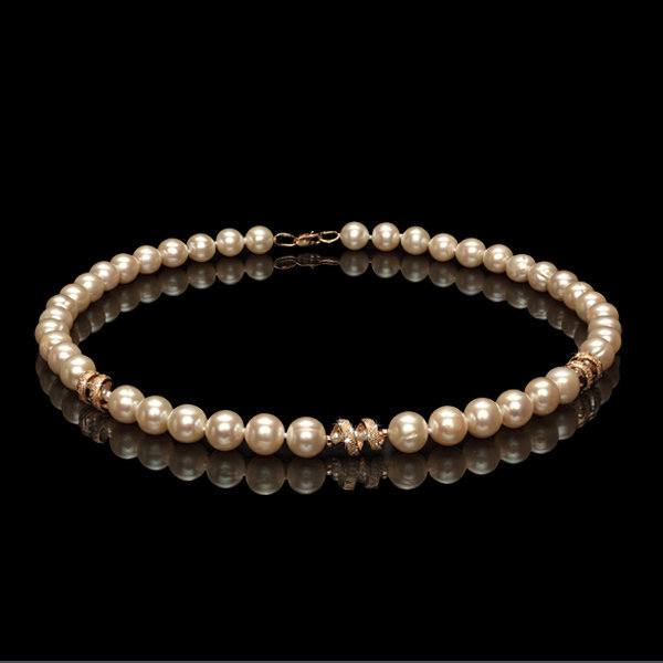 Прекрасные жемчужные бусы с изящным декором из красного золота 585 пробы с кристальными фианитами. Современное ювелирное исполнение с завораживающим сиянием перламутровых бусин, дополненных искристым блеском фианитов, привлекает внимание. Очаровательное украшение отлично подчеркнет индивидуальность и утонченный вкус обладательницы, и будет замечательным подарком. Приобретайте бусы выгодно в магазинах Мир Золота.