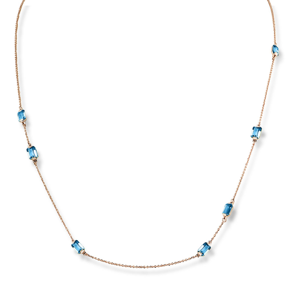 Стильное колье выполнено из красного золота 585 пробы с ассиметричными вставками с полудрагоценными голубыми топазами swiss.Украшение актуального дизайна, с обворожительным сиянием лазурных камней прямоугольной формы огранки, отлично дополнит современные образы, и подчеркнет индивидуальность и изысканный стиль владелицы. Приобретайте ювелирное украшение в подарок по выгодным ценам в магазинах Мир Золота.