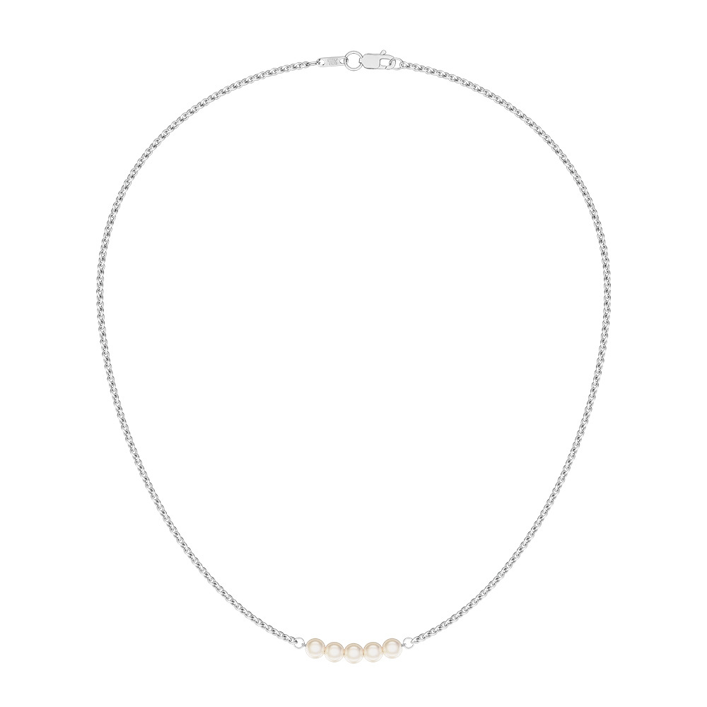 Нежное серебряное колье с декоративными вставками из белого жемчуга изящно подчеркнет естественную красоту женщины. Колье красивого плетения Гурмета кордино привлекательно смотрится на шее и покоряет своим очарованием. Приобретайте ювелирное украшение из коллекции «Самоцветы и жемчуг» KRASTSVETMET для прекрасного подарка своим любимым по выгодной цене в магазинах Мир Золота.
