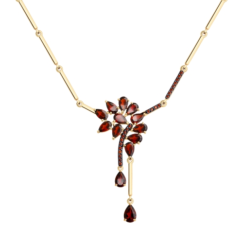 Великолепное колье из красного золота 585 пробы с натуральными гранатами и красными фианитами не останется незамеченным. Утонченное украшение с ярким миксом ювелирных камней насыщенного оттенка эффектно смотрится на шее, и привлекает восторженные взгляды. Колье будет идеальным подарком для любой женщины. Приобретайте ювелирное украшение выгодно в магазинах Мир Золота.