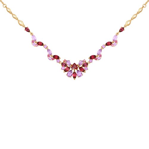 Изысканное колье из красного золота 585 пробы, украшенное миксом полудрагоценных камней аметистов и родолитов, позволит создать неповторимый женственный образ, дополнив его привлекательным блеском и очарованием. Нарядное украшение идеально подчеркнет красоту шеи и декольте. Приобретайте ювелирное украшение в подарок по выгодным ценам в магазинах Мир Золота.