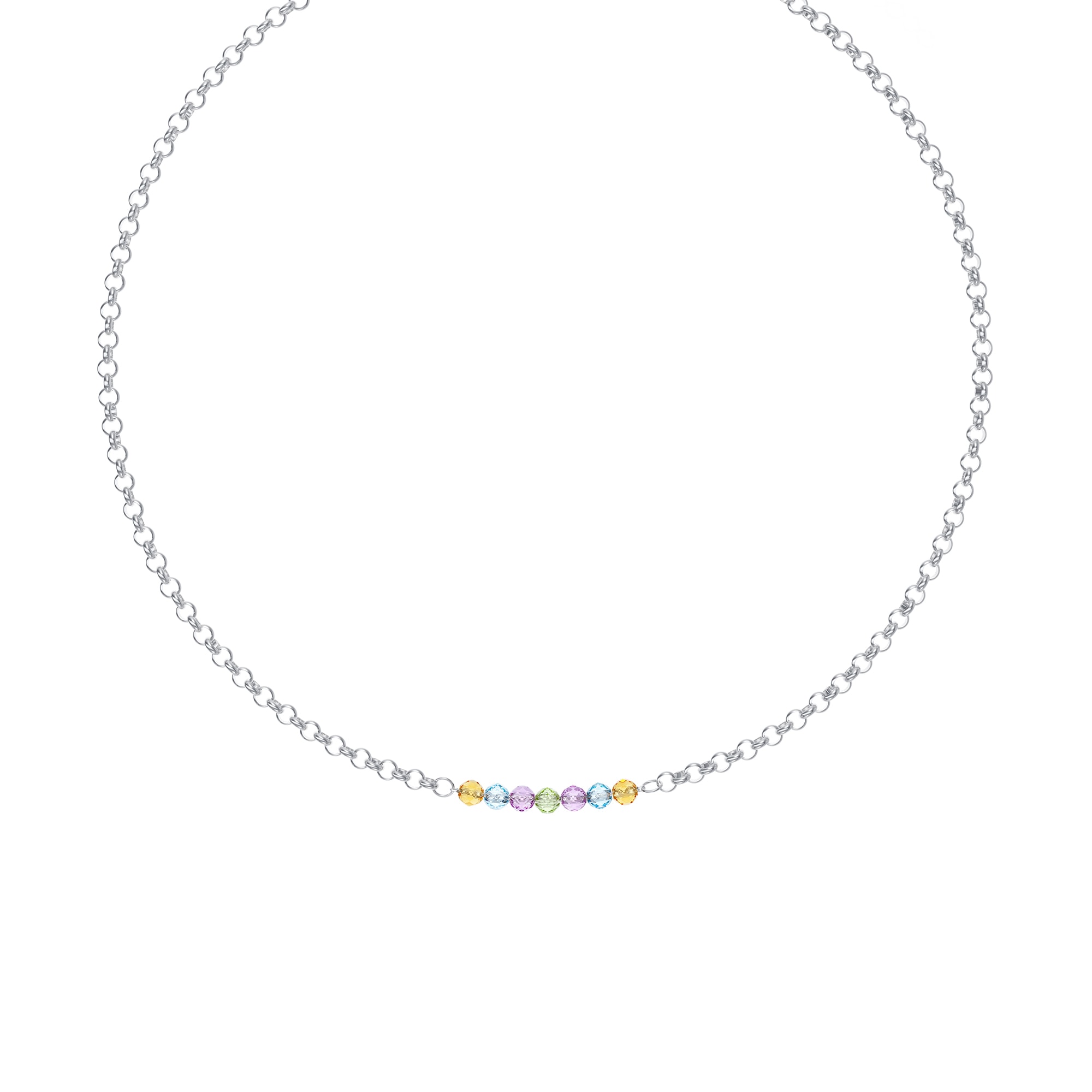 Колье из родированного серебра 925 пробы из цепочки плетения Тонда, украшенное миксом разноцветных камней, подчеркнет женственность и очарование владелицы. Серебряное колье с нежным блеском аметиста, хризолита, топаза и цитрина составит идеальное дополнение к летним образам. Приобретайте ювелирное украшение для себя или в подарок по выгодной цене в магазинах Мир Золота.
