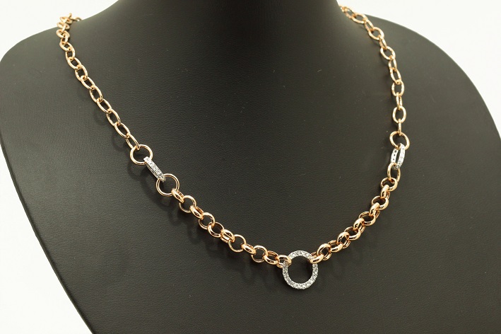 Колье из красного золота, состоящее из звеньев – это настоящее произведение ювелирного искусства. Вставки звеньев из белого золота, инкрустированные фианитами, гармонично создают единую композицию. Интересный дизайн позволяет колье быть одновременно элегантным и выразительным. Красное золото придает ему теплую и роскошную атмосферу, а фианиты добавляют блеск и сияние, делая украшение поистине уникальным. Это колье станет отличным выбором для тех, кто ценит красоту и качество в ювелирных изделиях.