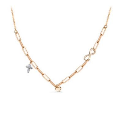 Изящное женское колье из красного золота демонстрирует превосходство стиля и символов, объединённых в одном ювелирном украшении. Дизайн подчёркивает современную эстетику, сохраняя при этом традиционные ценности и значимость каждого элемента.