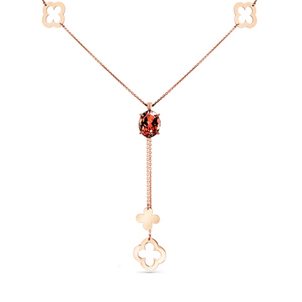 Чудесное колье с подвеской с натуральным гранатом и декоративными элементами выполнено из красного золота 585 пробы. Символичное украшение с образом четырехлистника и ярким акцентом красного граната смотрится нежно и очаровательно, и станет любимым повседневным аксессуаром владелицы. Приобретайте ювелирное украшение в подарок по выгодным ценам в магазинах Мир Золота.