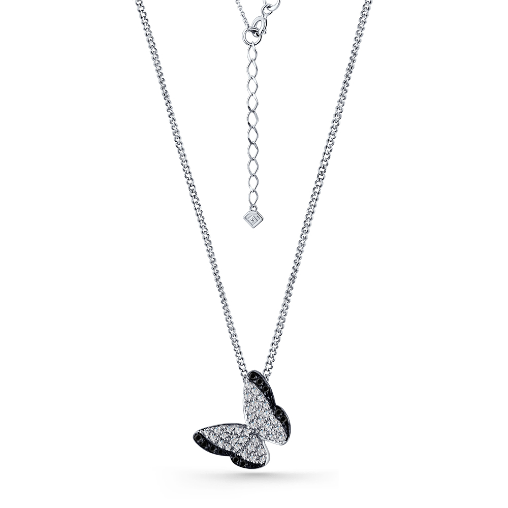 Колье на цепочке из родированного серебра 925 пробы с подвеской в виде изящной бабочки с россыпью прозрачных и черных фианитов. Очаровательный аксессуар с изумительным блеском ювелирных камней идеально дополнит утонченный образ, и подчеркнет женственность владелицы. Покупайте серебряное колье в подарок по выгодной цене в магазинах Мир Золота.