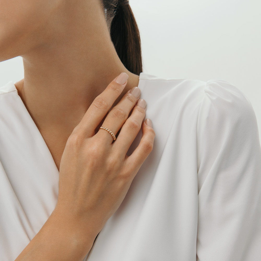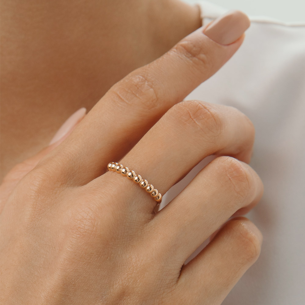 Кольцо с оригинальным декором в виде череды золотых шариков выполнено из красного золота 585 пробы. Изящное кольцо красиво переливается на свету, и станет изысканной деталью современного образа, подчеркнув женственность владелицы. Приобретайте ювелирное украшение в подарок по выгодной цене в магазинах Мир Золота.