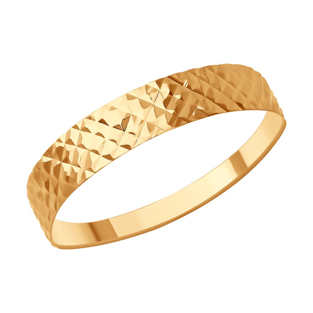 Кольцо выполнено из красного золота, обладающего теплым и богатым оттенком. Поверхность изделия обработана алмазной гранью, что создает игру света и тени, придавая кольцу особую изысканность. Алмазная грань подчеркивает текстуру металла, делая его визуально более объемным и выразительным. Такое кольцо станет стильным аксессуаром, который дополнит любой образ своей утонченностью и шармом.