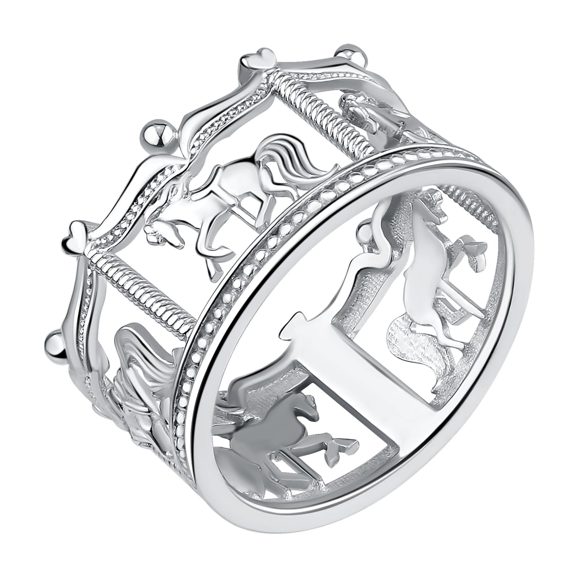 Серебряное кольцо без вставок в виде карусели привлекает внимание своей необычной формой и игривым дизайном. Карусель, выполненная в мельчайших подробностях, напоминает нам о беззаботных детских играх и праздниках. Гладкое серебристое покрытие подчеркивает легкость и воздушность композиции, превращая кольцо в стильный и оригинальный аксессуар, подходящий как для повседневной носки, так и для торжественных мероприятий.
