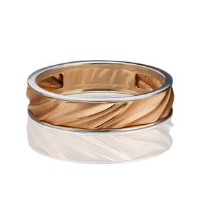 Статусное кольцо из красного и белого золота с оригинальной рифленой поверхностью, символизирует слияние двух сердец. Алмазная обработка создает объем и фактуру поверхности, тем самым подчеркивая неповторимость и оригинальность любящей пары. Купите свои идеальные обручальные кольца в ювелирных магазинах Мир Золота и Ваши образы в главный день будут безупречны.