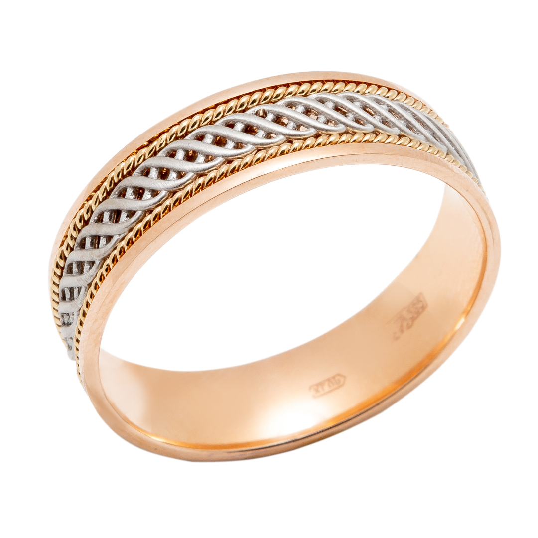 Обручальное кольцо из комбинированного золота 585 пробы интересного ювелирного дизайна с плетеным орнаментом стильно смотрится, и великолепно украсит повседневные образы. Оригинальное массивное кольцо станет для пары символом счастливой и благополучной семейной жизни. Приобретайте обручальное кольцо унисекс по привлекательной цене в магазинах Мир Золота.