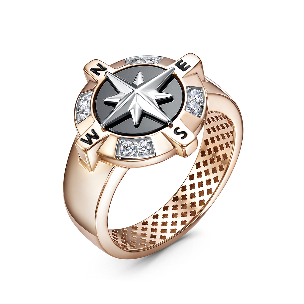 Печатка из красного золота с ониксом и фианитами «Роза ветров»