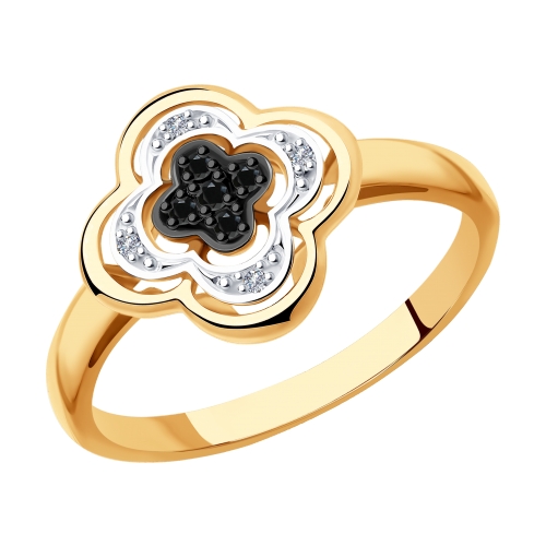 Оригинальное женское кольцо из красного золота 585 пробы с чёрными и прозрачными бриллиантами. Дизайн кольца стильно оформлен в виде клевера, что символизирует удачу. Эффектное сочетание чёрно-белых бриллиантов в современном стиле продиктовано новыми трендами в классических ювелирных украшениях. Приобретайте это кольцо по выгодным ценам в магазинах Мир Золота.
