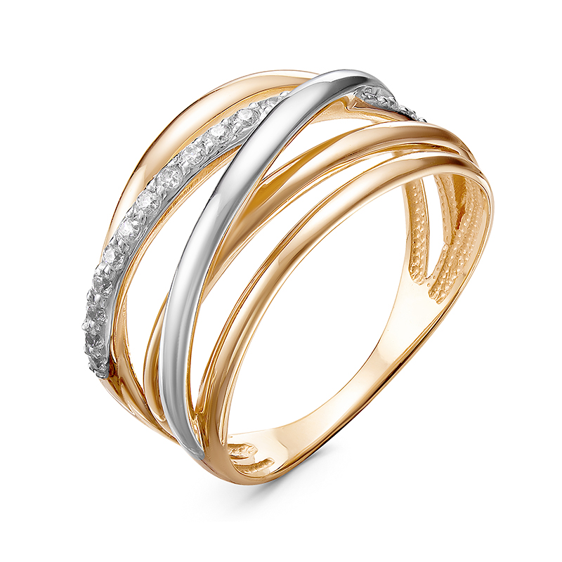 Превосходное женское кольцо из красного и белого золота 585 пробы с сияющими бриллиантами. Стильный необычный дизайн кольца с искрящейся дорожкой из 15 бриллиантов подчеркнет пленительную солидность обладательницы и никого не оставит равнодушным. Приобретайте замечательное кольцо по выгодным ценам в магазинах Мир Золота.