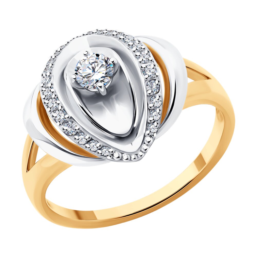 Роскошное кольцо с объемным декором из красного и белого золота 585 пробы с натуральными бриллиантами не останется незамеченным. Великолепный дизайн с ослепительным сиянием драгоценных камней на фоне белого золота эффектно смотрится, и станет изысканным дополнением неповторимого образа современной леди. Покупайте украшение в подарок по привлекательной цене в магазинах Мир Золота.