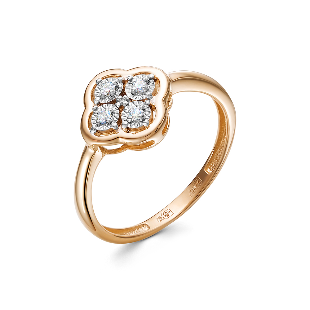 Кольцо из красного золота 585 пробы в виде четырехлистного клевера декорировано натуральными бриллиантами. Мягкие линии золота, обрамляющие кристальные бриллианты, выгодно подчеркивают их природную красоту и изысканное сияние. Актуальный символичный дизайн станет ярким акцентом стильного образа современной леди. Приобретайте украшение с модными акцентами в подарок по выгодной цене в магазинах Мир Золота.