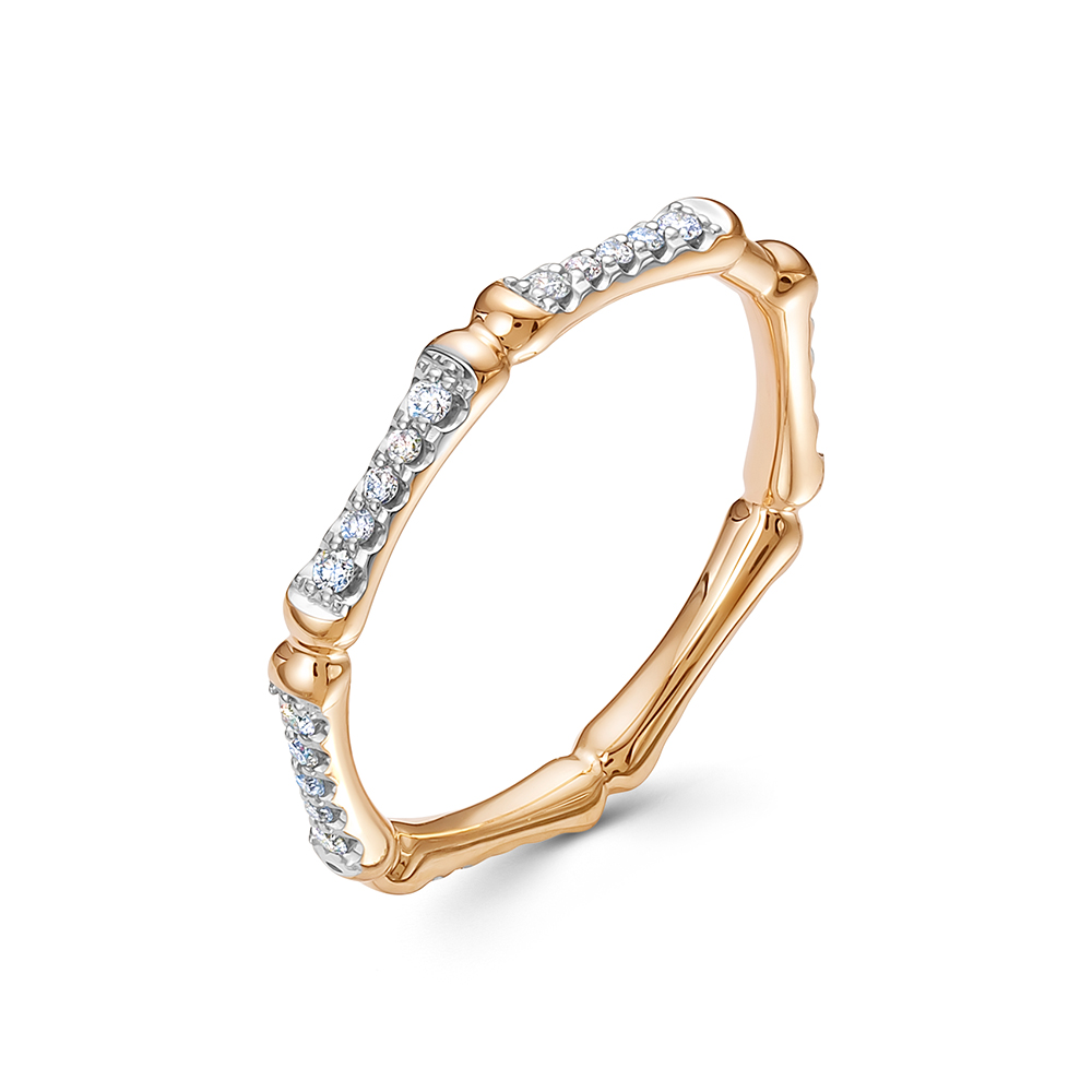 Кольцо из красного золота 585 пробы с дорожками сверкающих бриллиантов выполнено в интересном ювелирном дизайне. Утонченное украшение с изысканным блеском натуральных камней привлекательно смотрится на руке, и станет стильным дополнением современных образов обладательницы. Приобретайте ювелирное кольцо для себя или в подарок по выгодной цене в магазинах Мир Золота.