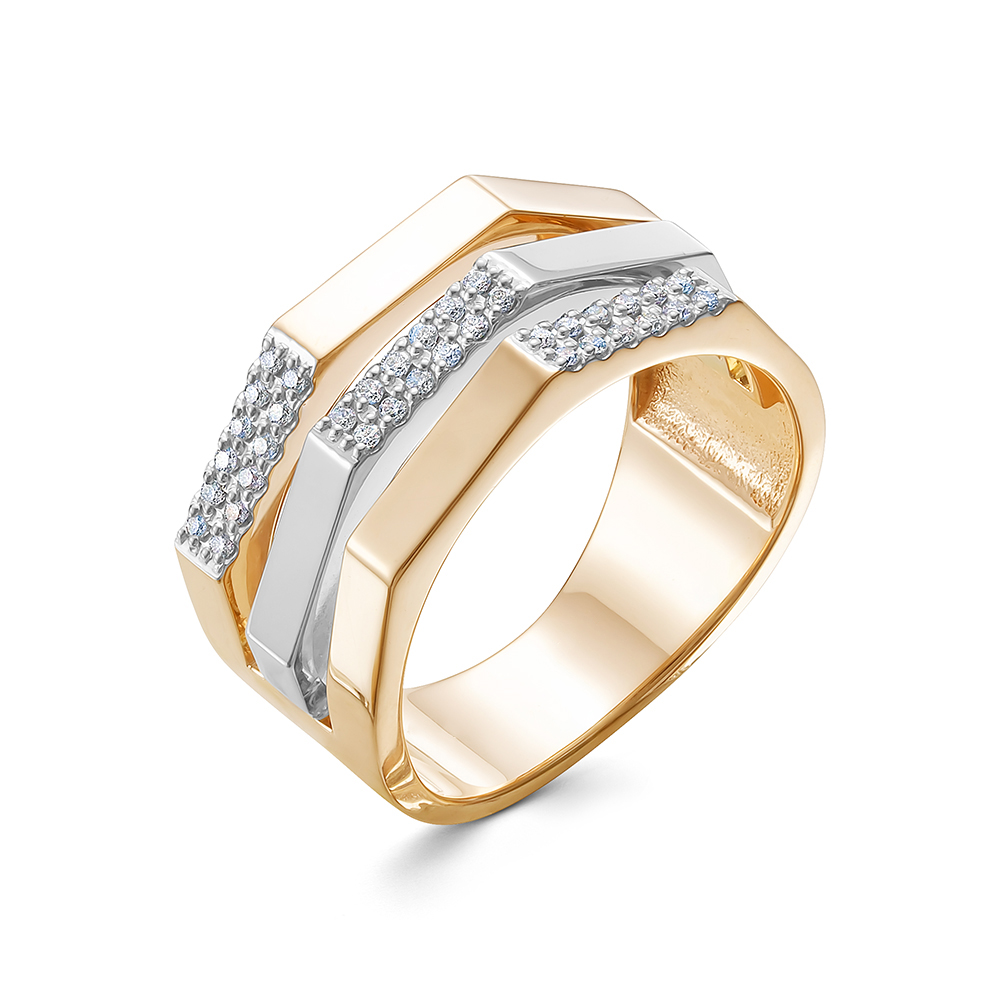 Объемное кольцо современного дизайна из красного и белого золота 585 пробы с ослепительным блеском бриллиантов придется по вкусу поклонницам крупных ювелирных аксессуаров. Безупречные грани благородного золота, подчеркнутые драгоценным сиянием бриллиантовых дорожек, создают стильный образ украшения. Приобретайте кольцо в комплекте с серьгами по выгодной цене в магазинах Мир Золота.
